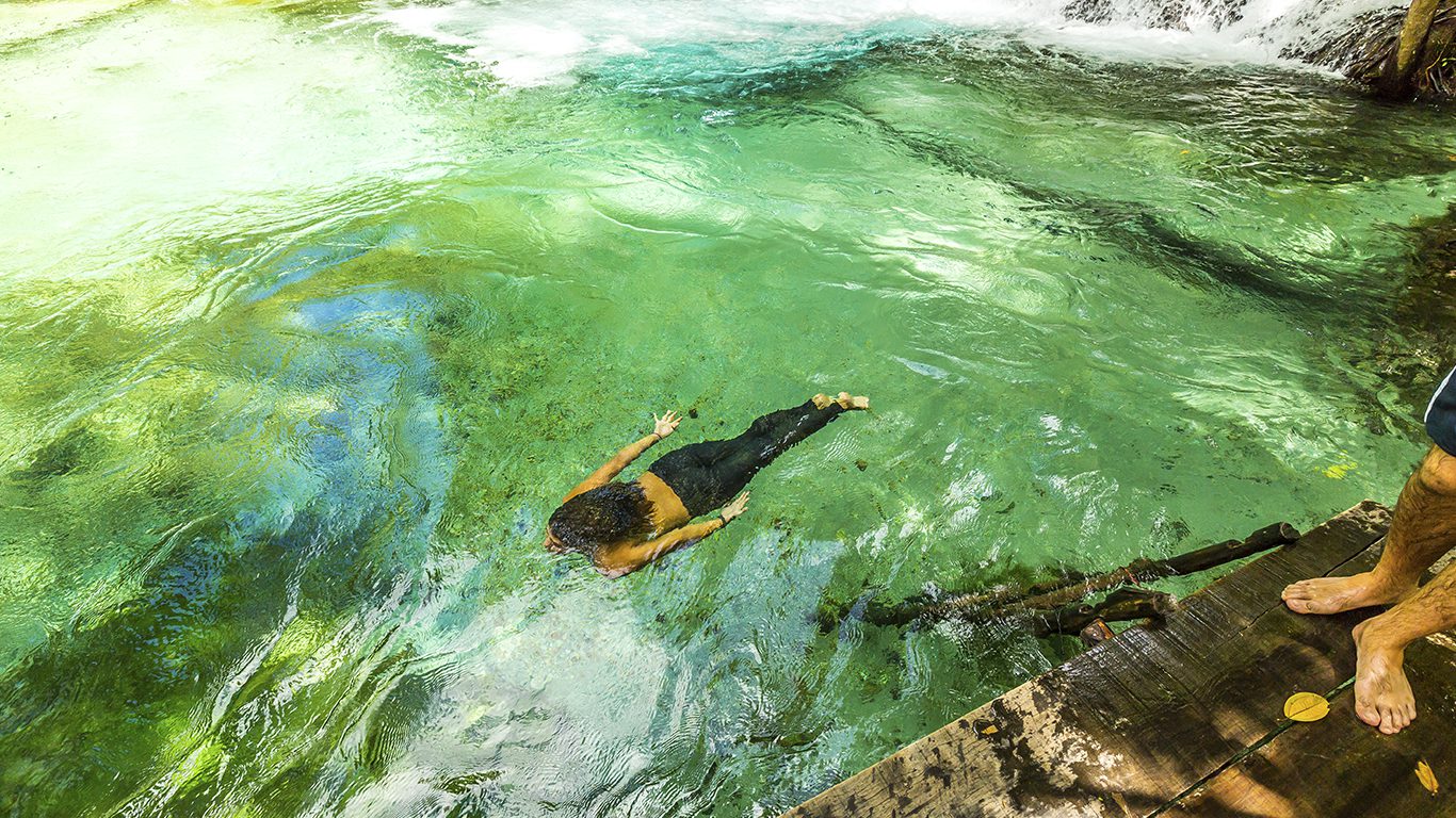 Com formato de ferradura e alimentada pelo Rio Novo, a Cachoeira da Velha é a maior e mais famosa. Somadas, as duas quedas têm cerca de 100 metros de largura e 15 de altura e não é aberta para banhos. Mas, perto dali está a Prainha do Rio Novo, um dos mais puros do mundo.