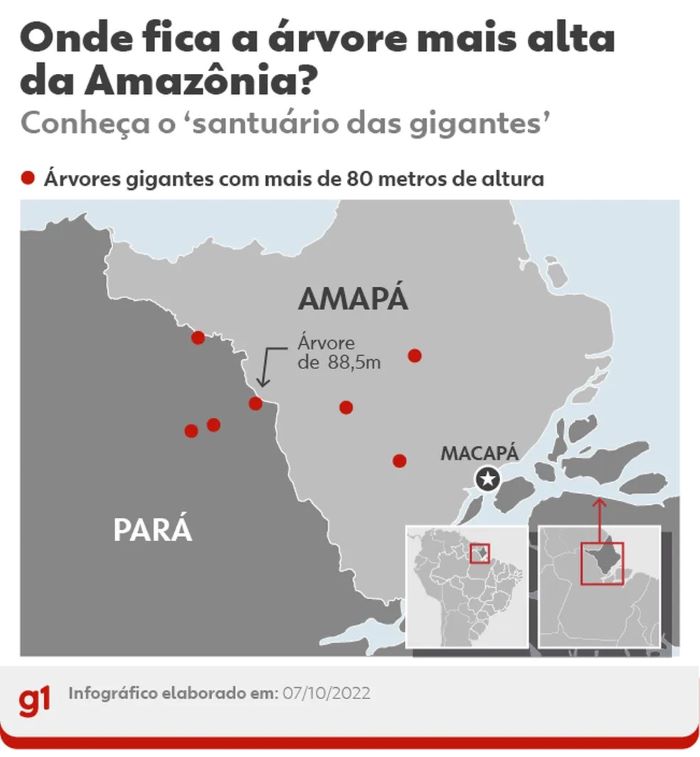 Sua altura é um recorde para a Amazônia brasileira, que ainda não tinha registrado nenhuma árvore com mais de 70 metros de altura. Na mesma área do gigante (veja no mapa abaixo), pesquisadores encontraram outros exemplares de angelim com mais de 80 metros.